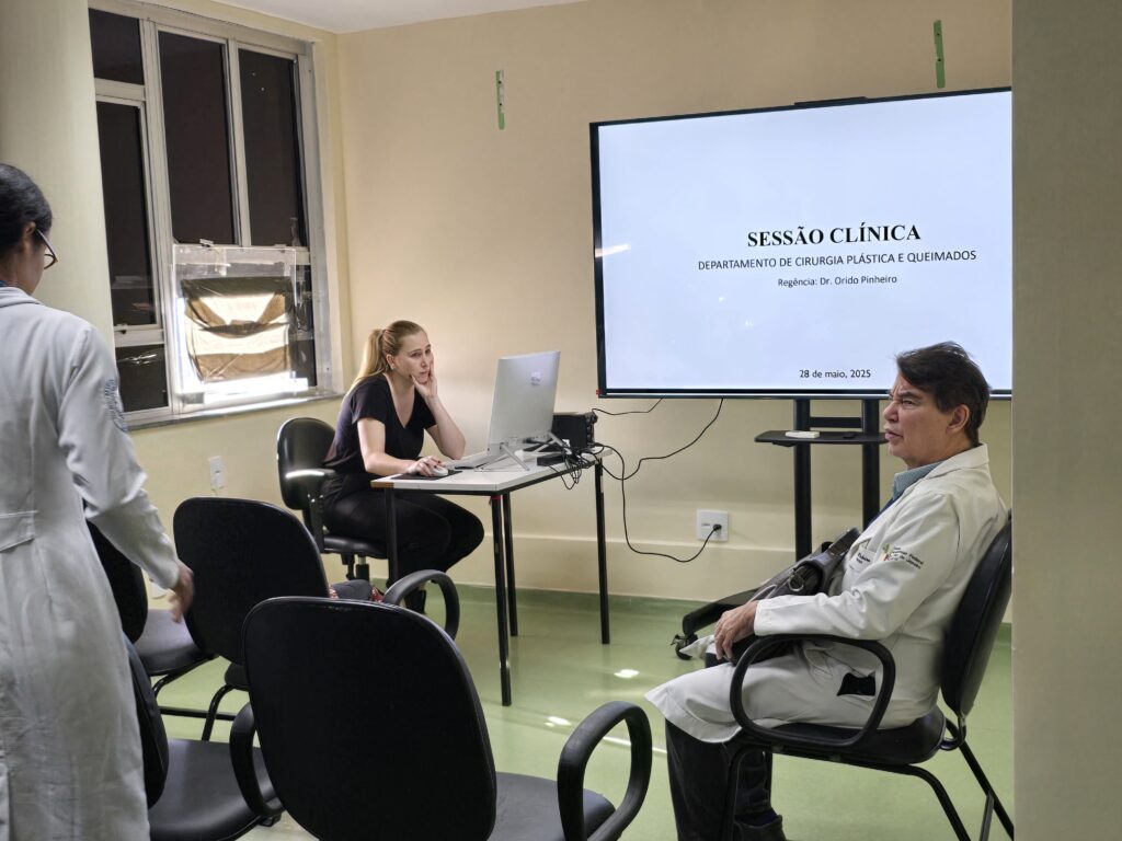 Na manhã desta quarta-feira, 28 de maio de 2025, na Sala Multiuso no 12º andar do Hospital do Andaraí, houve uma reunião com o Dr. Orido Pinheiro, chefe da cirurgia plástica, residentes e estagiários do serviço da plástica. No encontro, apresentaram casos selecionados para discussão, referentes a pacientes operados. Estiveram presentes 12 pessoas.