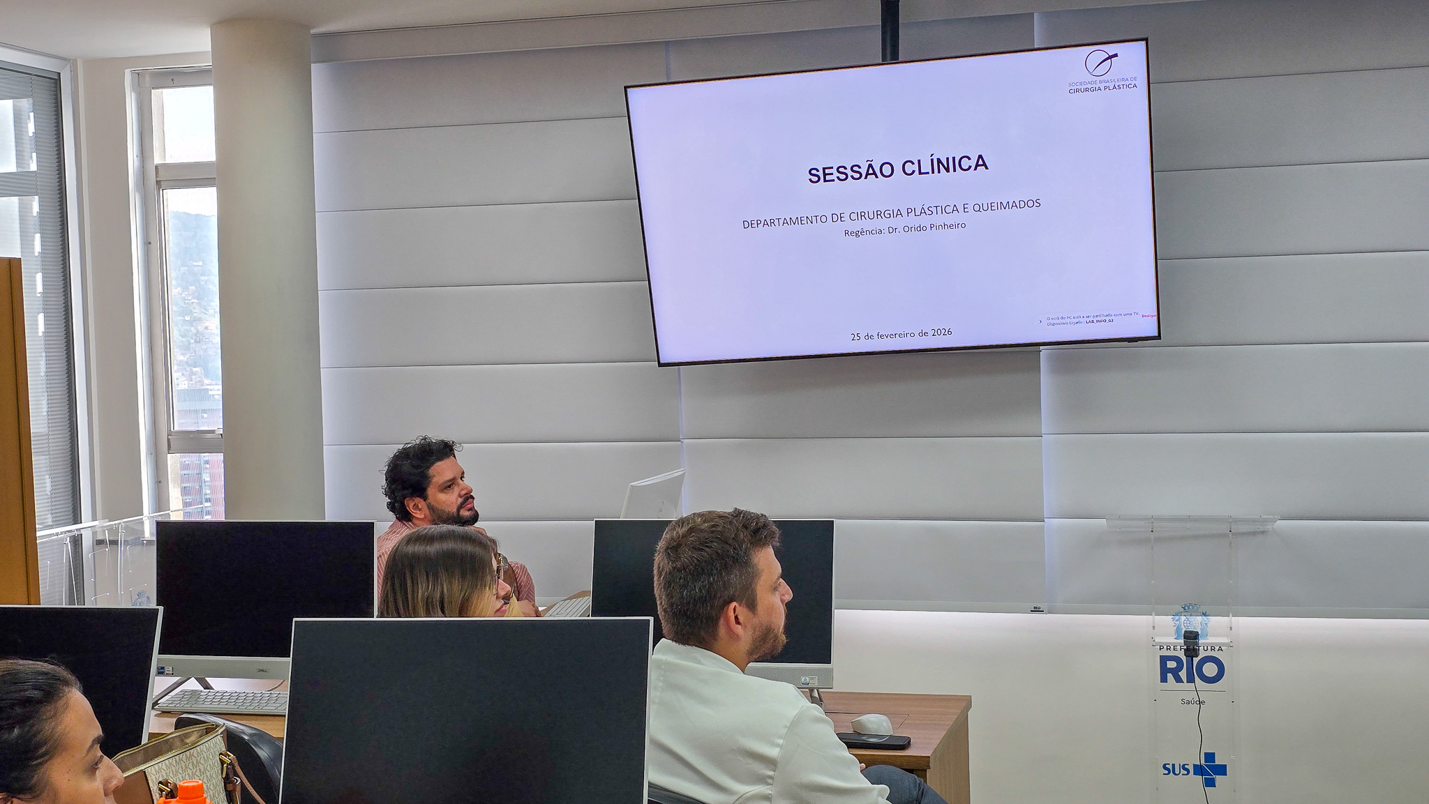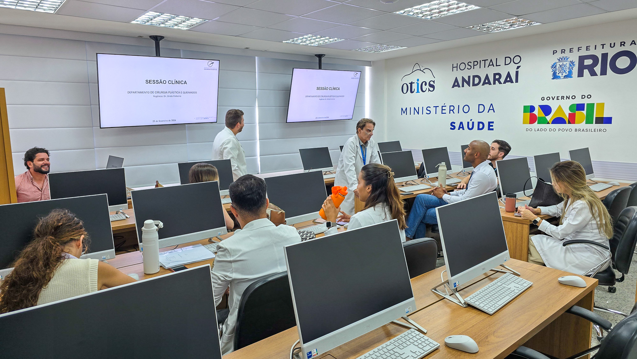 Na manhã desta quarta-feira, 25 de fevereiro de 2026, no Laboratório de Informática na Estação OTICS Andaraí, houve uma reunião com o Dr. Orido Pinheiro, chefe da cirurgia plástica, residentes e estagiários do serviço da plástica. No encontro, apresentaram casos selecionados para discussão, referentes a pacientes operados. Estiveram presentes 17 pessoas.