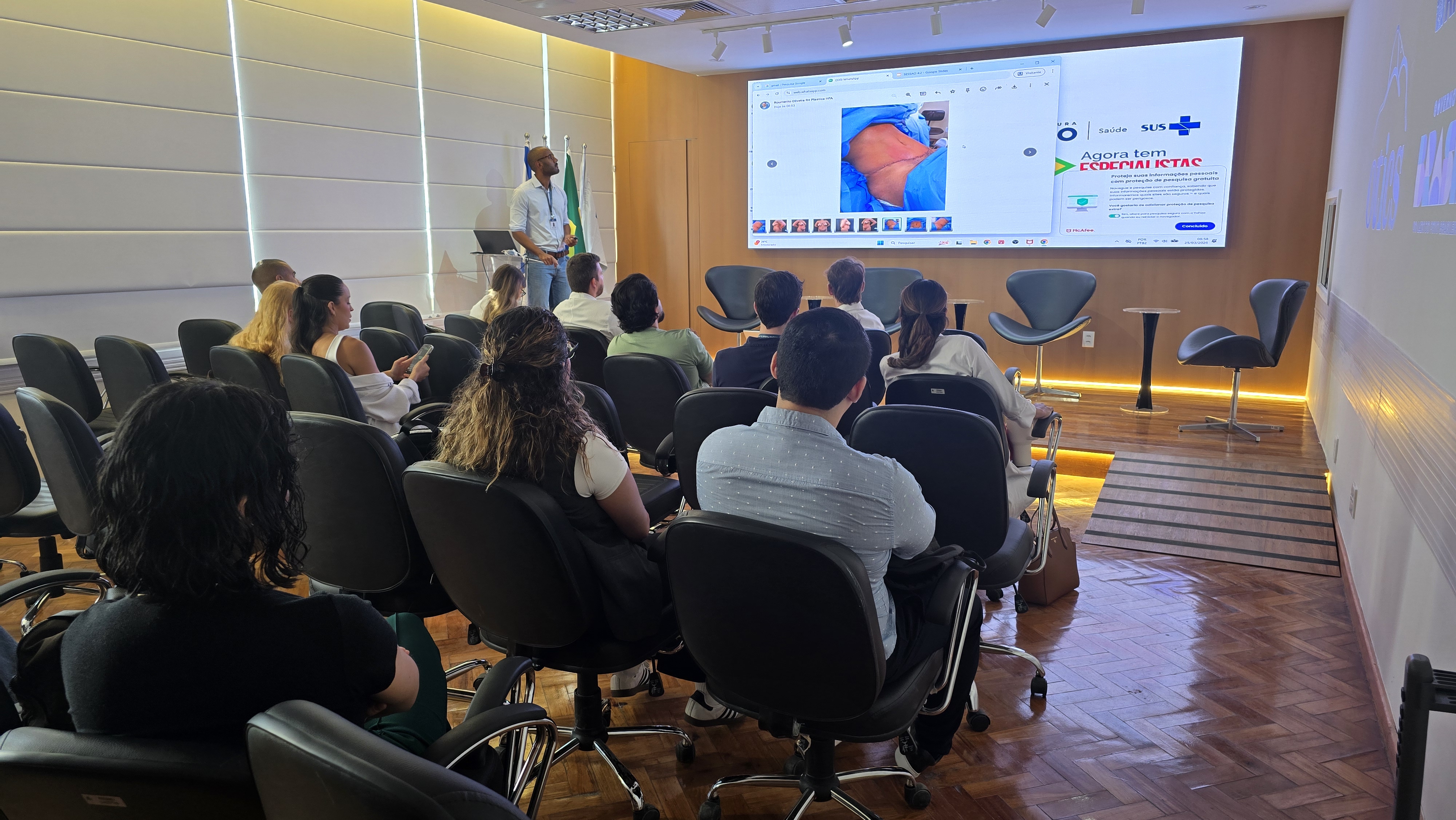 Na manhã desta quarta-feira, 25 de março de 2026, no Auditório – 1 da Estação OTICS Andaraí, houve uma reunião com o médico Orido Pinheiro, chefe da cirurgia plástica, residentes e estagiários do serviço da plástica. No encontro, apresentaram casos selecionados para discussão, referentes a pacientes operados. Estiveram presentes 13 pessoas.