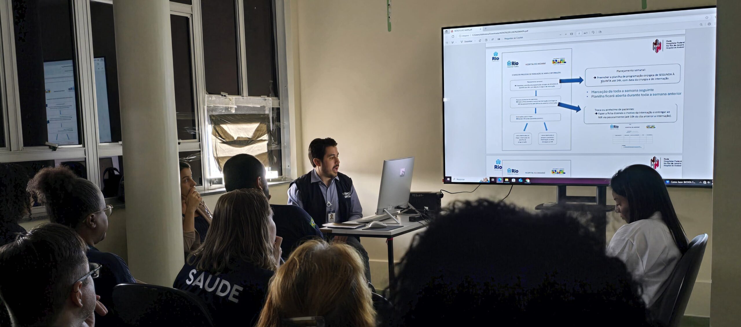 Alinhamento de fluxos com secretários de serviços cirúrgicos na sala multiuso da OTICS-Rio Andaraí